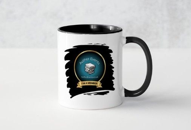 This ceramic mug celebrates the Author Events community with two bold designs: