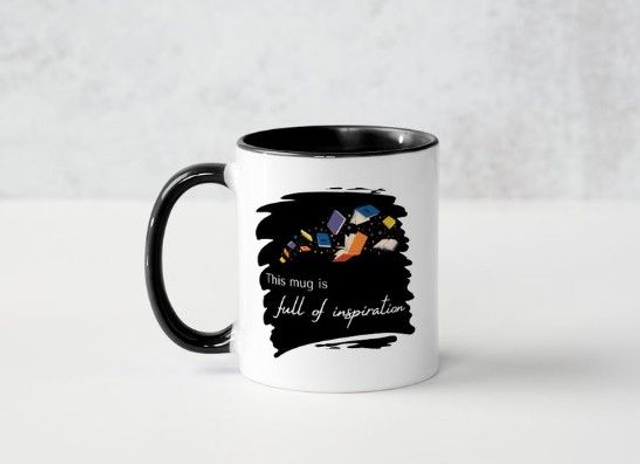 • Front: “This mug is full of inspiration” with a cascade of colourful books.